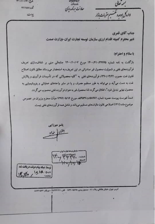 به گزارش بازار قیر اداره کل بودجه و تنظیم مقررات بازار معاونت برنامه ریزی وزارت نفت در تاریخ 14/10/1400 در پاسخ به استعلام سازمان توسعه تجارت در خصوص شفاف سازی تعریف فراورده های نقتی و شمولیت محصول قیر در این تعریف، به صراحت اعلام نموده اند که محصول قیر به عنوان فراورده نفتی محسوب می گردد.
